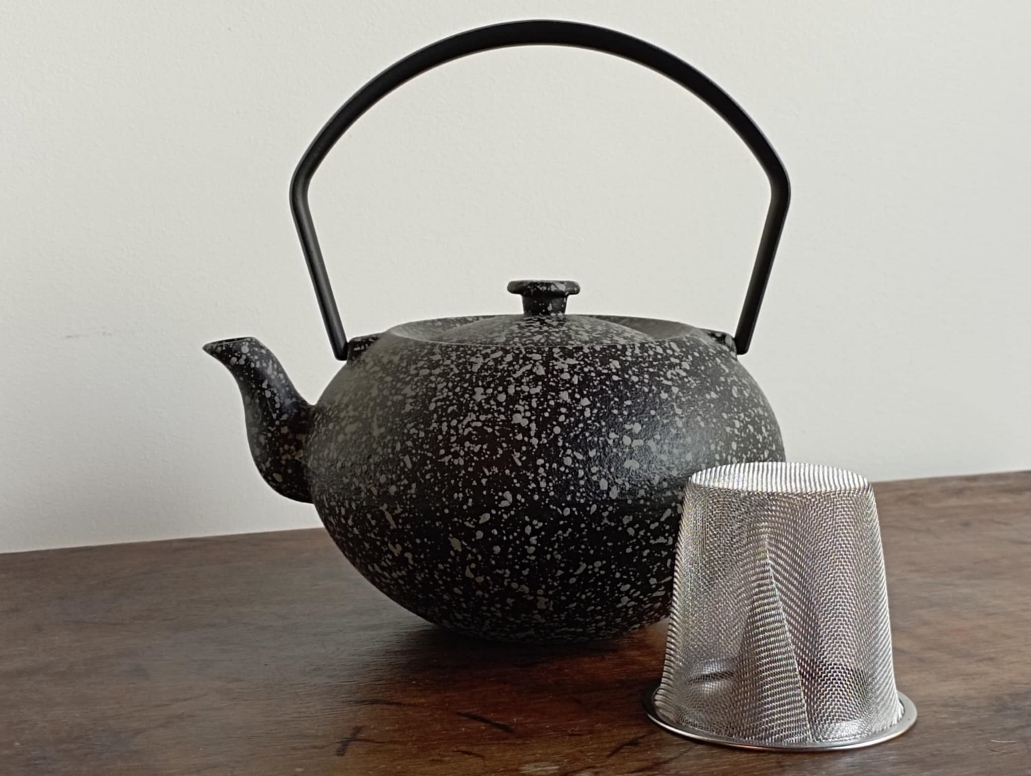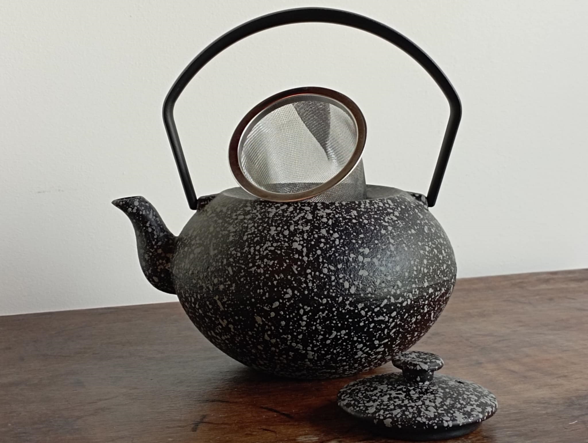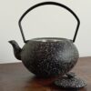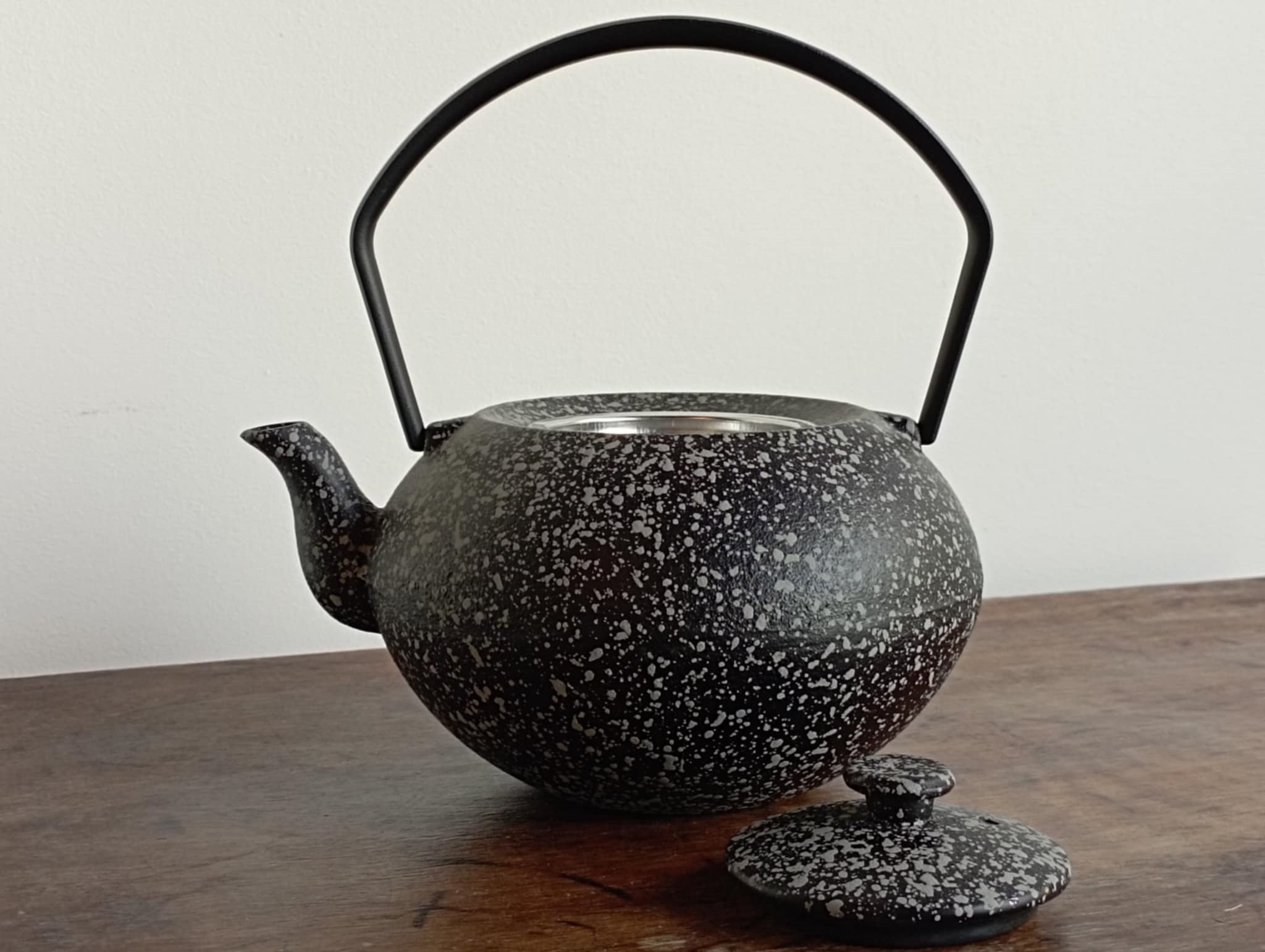 Het is een zwarte theepot met grijze spikkels